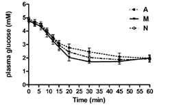 制剂A未加入烟酰胺和精氨酸;制剂N只加入烟酰胺;制剂M即加入烟酰胺,又加入精氨酸。从图中可以看出,血糖降低速率,M好于N,N好于A,研究结果表明烟酰胺和精氨酸的加入可有效速效降低血糖。