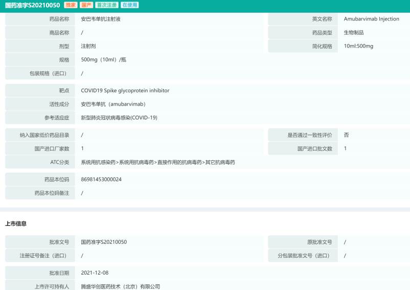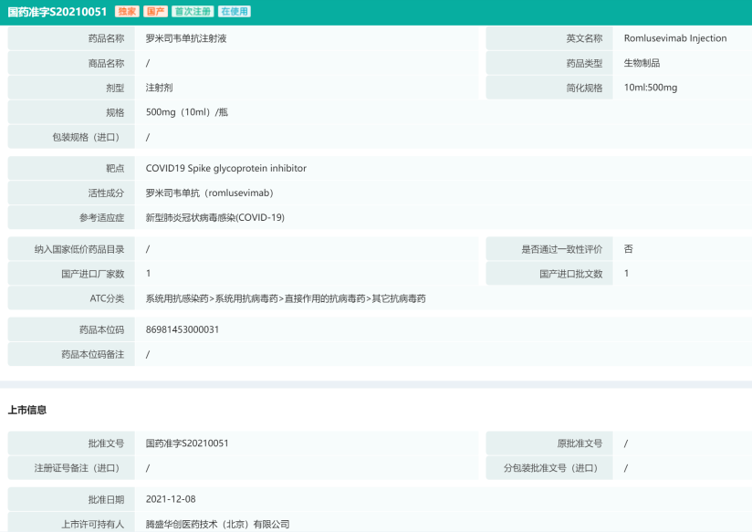 安巴韦单抗注射液(BRII-196)、罗米司韦单抗注射液(BRII-198),为我国首家获批拥有自主知识产权新冠病毒中和抗体联合治疗药物,上述两个药品可治疗新型冠状病毒肺炎(COVID-19),联合用于治疗轻型和普通型且伴有进展为重型(包括住院或死亡)高风险因素的成人和青少年(12—17岁,体重≥40kg)新型冠状病毒感染(COVID-19)患者,其中,青少年(12—17岁,体重≥40kg)适应症人群为附条件批准,其获批上市为新冠肺炎治疗提供了更多选择。