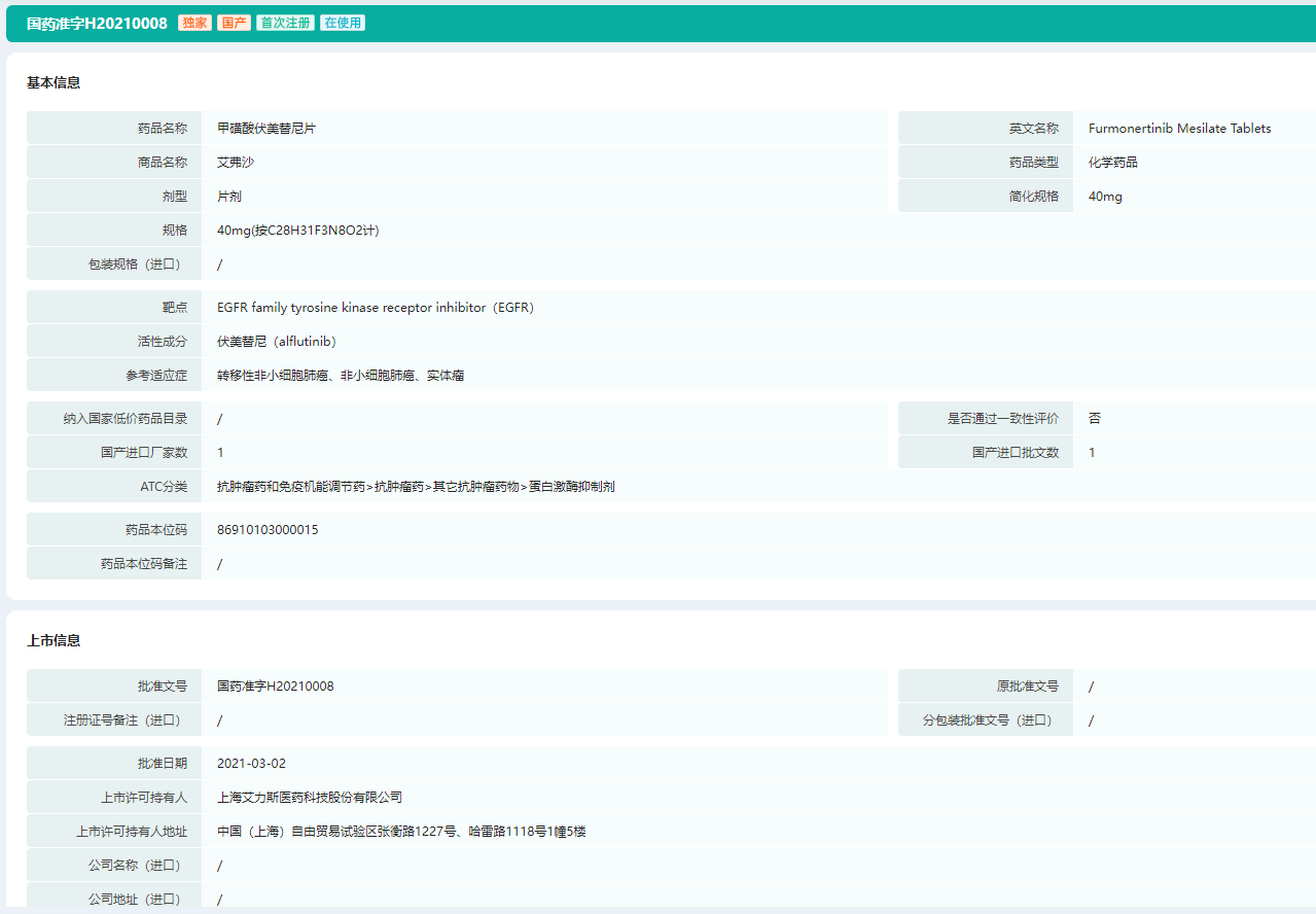比如纳入突破性治疗药物程序中的非小细胞肺癌治疗药物甲磺酸伏美替尼片(商品名:艾弗沙),为上海艾力斯医药科技股份有限公司自主研发的 1.1 类新药,其二线适应证于2021年3月获批上市,适用于既往经表皮生长因子受体(EGFR)酪氨酸激酶抑制剂(TKI)治疗时或治疗后出现疾病进展,并且经检测确认存在EGFR T790M突变阳性的局部晚期或转移性非小细胞性肺癌(NSCLC)成人患者的治疗。