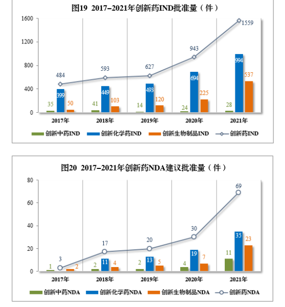 以药品类型统计,创新中药39件(39个品种),同比增长39.29%;创新化学药1029件(463个品种),同比增长44.32%;创新生物制品560件(376个品种),同比增长141.38%。以注册申请类别统计,IND1559件(831个品种),同比增长65.32%,NDA69件(47个品种),同比增长130.00%。