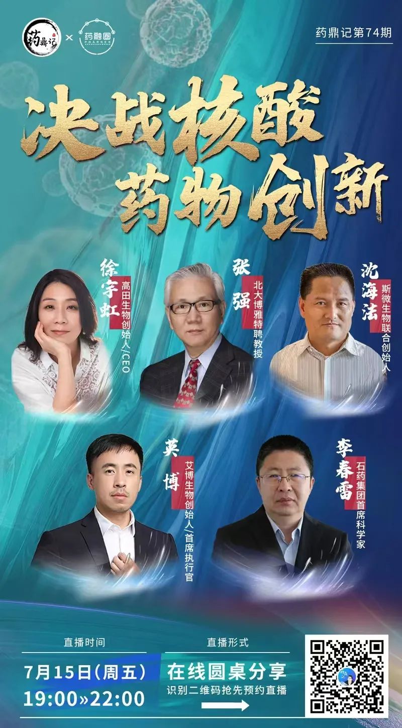 那么,国内核酸药物该如何进行创新发展呢?7月15日晚上19点,药鼎记直播间邀请了北大博雅特聘教授张强、石药集团首席科学家李春雷、高田生物创始人徐宇虹、斯微生物联合创始人沈海法、艾博生物创始人英博等5位大佬,带你探讨如何进行核酸药物创新。干货满满,欢迎点击文章顶部“预约按钮”或者识别下图“二维码”进行预约。