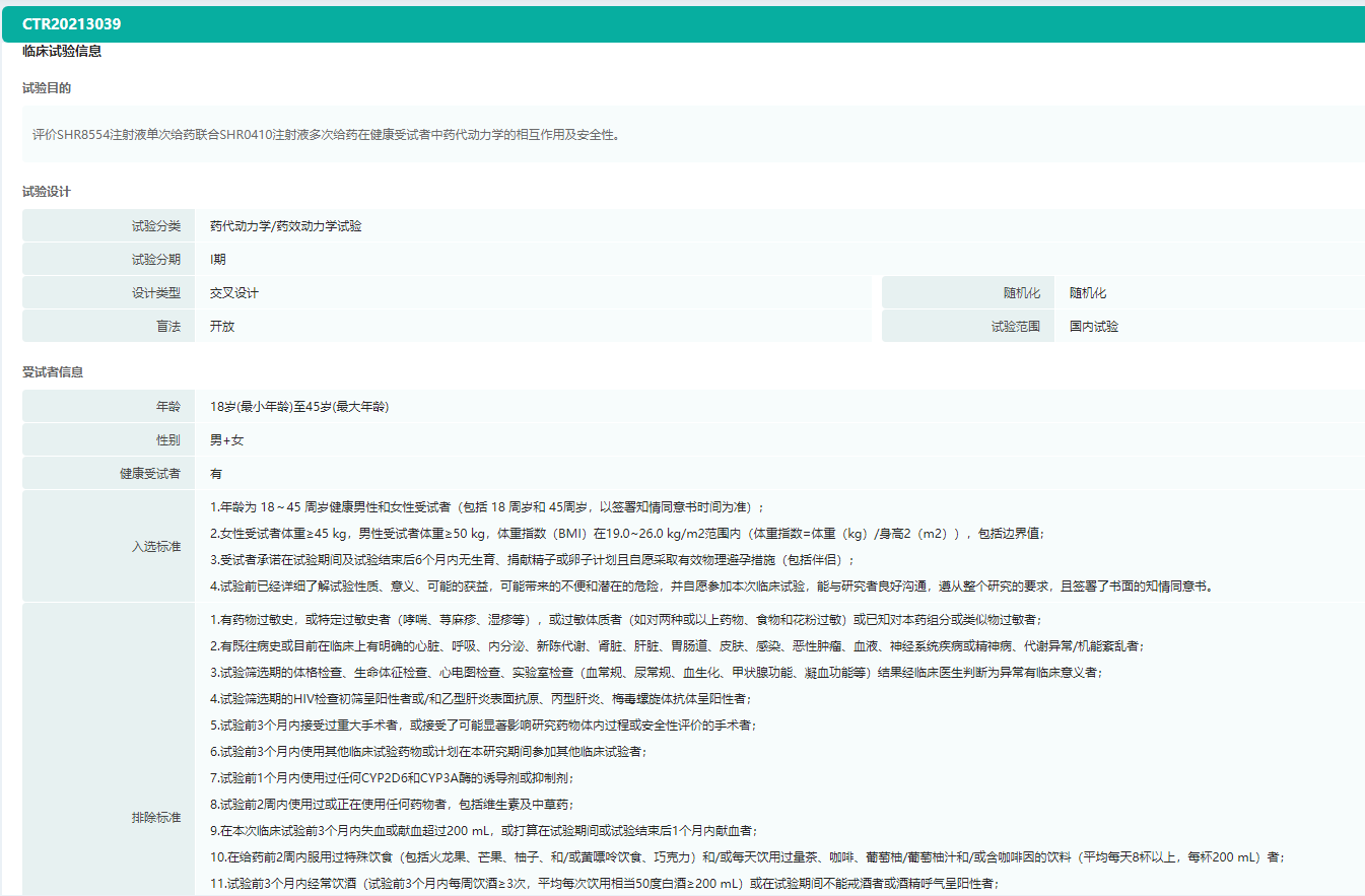 通过药融云中国临床试验数据库可以看到,SHR8554在2018年5月首次启动国内I期临床,于2019年5月完成试验。目前II期、III期临床试验正在进行中。2021年12月,恒瑞医药宣布,SHR8554 注射液的III期临床试验(SHR8554-301)主要研究终点达到方案预设的优效标准。