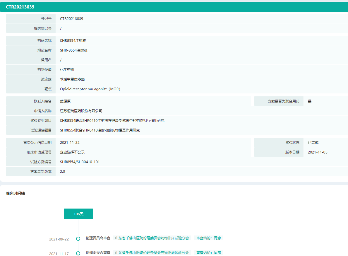 CTR20210486临床试验是针对SHR8554注射液用于骨科手术后镇痛的Ⅱ/Ⅲ期临床试验,第一例受试者入组日期为2021年4月19日,已入组人数193人。该研究由上海交通大学医学院附属仁济医院俞卫锋博士担任主要研究者,全国22家医院共同参与。(更多临床试验详细信息,可前往药融云数据库官网进行查看)
