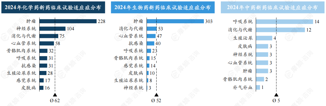 四、肿瘤为新药研发第一大治疗领域,2024年肿瘤新药临床试验合计超500项