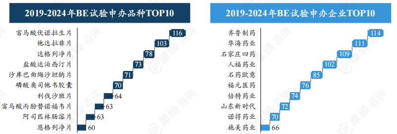 近六年BE试验数量前十品种中,富马酸伏诺拉生片、他达拉非片、达格列净片登记试验数量最多,分别有116项、103项、78项。