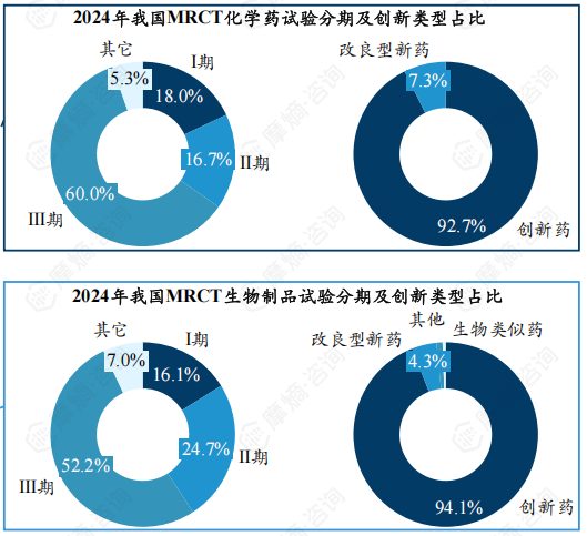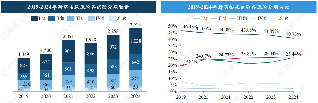占比方面,近年我国Ⅰ期临床试验占比呈下降趋势,2024年占比约40.73%;与此同时,Ⅱ期、Ⅲ期临床则呈现出上升的积极变化,占比分别为25.44%和25.91%。
