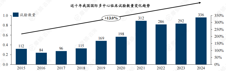 近十年我国MRCT数量从112项提升至336项,CAGR达13%。整体来看,目前我国国际多中心临床试验规模尚小,占比约13.4%,但增长势头强劲,预计2025年将突破400项。