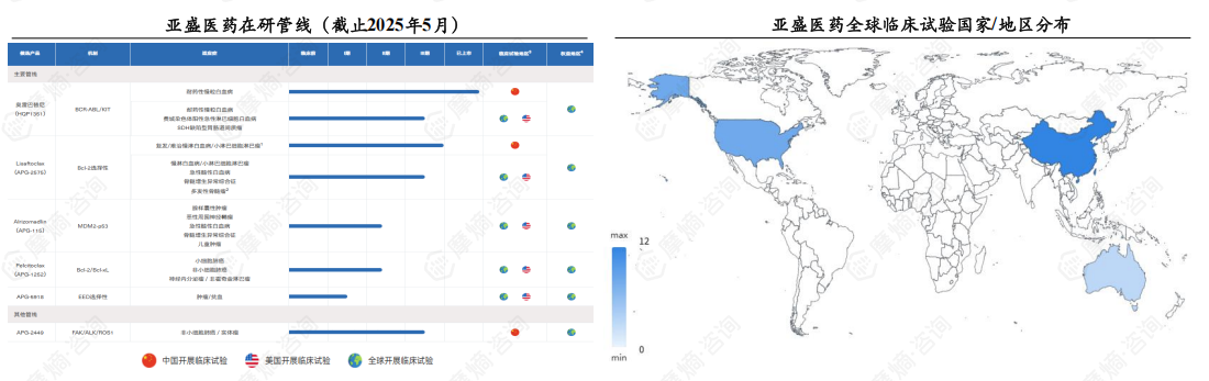 亚盛医药是一家立足中国、面向全球的创新型生物医药公司,于2019年10月在香港联交所上市,2025年1月在美国纳斯达克上市。公司拥有多个处于美国或国际临床试验阶段的产品,核心产品奥雷巴替尼为第三代BCR-ABL酪氨酸激酶抑制剂,已在中国获批用于治疗T315I突变慢性髓细胞白血病,2023年奥雷巴替尼国际多中心III期临床研究启动,国际临床布局持续推进。