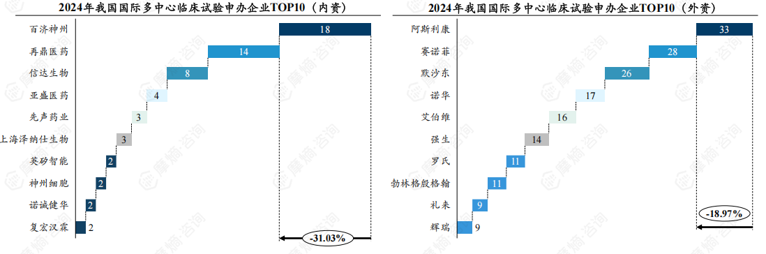 2024年我国MRCT申办企业排行榜:内资企业中,百济神州以18项位居榜首,再鼎医药和信达生物分别以14项和8项位列第二和第三。外资企业中,阿斯利康以33项遥遥领先,赛诺菲和默沙东分别以28和26项紧随其后。