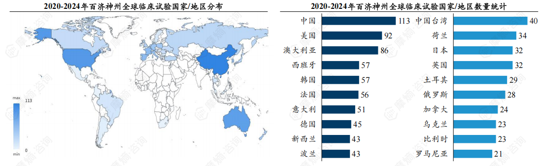 (1)全球临床试验总计开展142项,赴美国、澳大利亚开展临床试验数量显著。