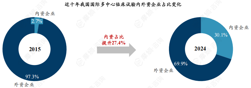 内资企业占比大幅提升:2015年内资企业仅占2.7%,而外资企业占比高达97.3%。2024年内资企业占比提升至30.1%,外资企业占比下降至69.9%,十年间内资药企占比提升27.4%。