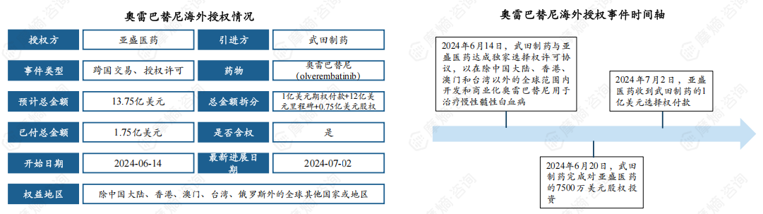 2024年6月14日,亚盛医药与武田制药达成一项独家许可协议,武田制药将获得奥雷巴替尼在除中国大陆、香港、澳门、台湾和俄罗斯以外所有市场的全球商业化独家选择权。根据协议条款,该交易总金额高达13.75亿美元,具体结构包括1亿美元的首笔期权付款,12亿美元的里程碑付款,以及7500万美元的股权认购。此次重磅合作标志着奥雷巴替尼国际化进程进一步加速。