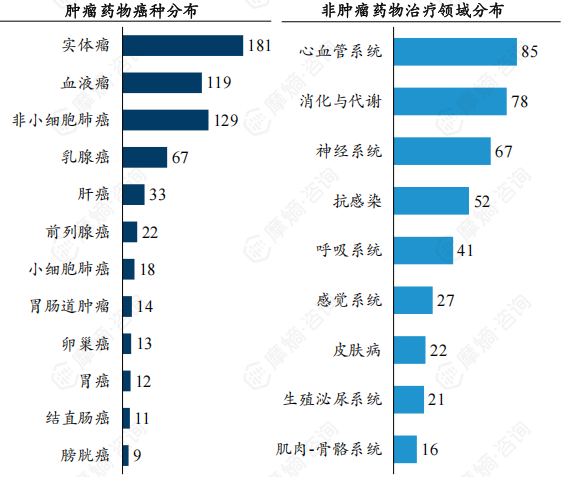 5.非小细胞肺癌、乳腺癌等高发癌种占主导地位,非肿瘤药物集中在心血管系统、消化与代谢等领域