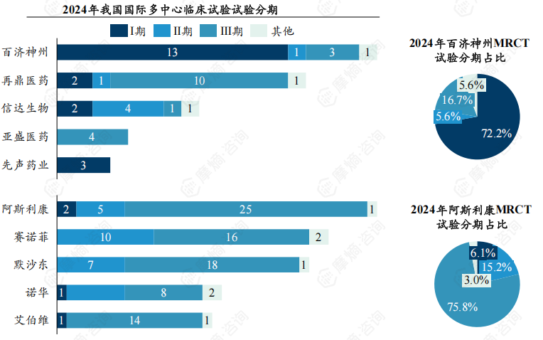 百济神州:2024年开展的国际多中心临床试验Ⅰ-Ⅲ期数量分别有13、1、3项,I期试验占比72.2%,显示出其在早期研发阶段的高投入和广泛布局。再鼎医药:2024年开展的国际多中心临床试验Ⅰ-Ⅲ期数量分别有2、1、10项,高Ⅲ期占比与其“全球引进+快速临床推进”的商业模式高度吻合。