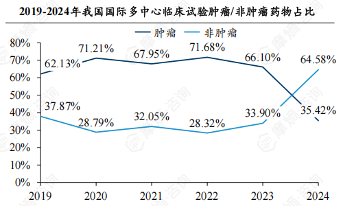 从治疗领域来看,肿瘤药物占比从2019年的62.13%下降到2024年的35.42%,而非肿瘤药物占比则从37.87%上升到64.58%。