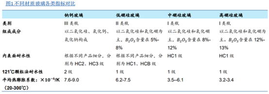 药用玻璃包材的种类及性质:根据线性热膨胀系数以及三氧化硼含量不同,并结合玻璃性能要求将药用玻璃分为高硼硅、中硼硅、低硼硅、钠钙玻璃四类,不同材质玻璃指标对比见图1[1]。