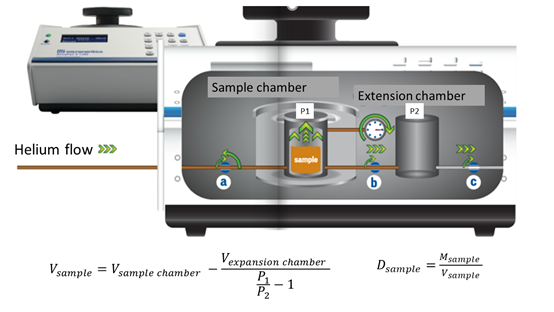 因为液体密度测量技术的弊端,目前行业内有氦气(或其他气体)密度计,与液体密度计相比气体密度计更加简易、快速、精确且可重复测试。气体密度计测量物质密度是一种非破坏性的技术,使用气体置换来精确测量物体真实体积,使其成为测量物体真实密度的理想方法。使用氦气密度计,我们只需将一个已知重量的样品密封在样品室中,保持恒温。然后氦气被加入到系统中,氦气密度计样品室中的压力达到平衡。由于氦是一种小分子,它能够渗透到样品的孔隙中。然后将样品室的氦气释放到扩展室,压力再度达到平衡,用该平衡压力与气体定律计算样品的体积。最后从系统中把压力释放出来,并取出样品。因此,用氦气密度计测量得到的物体的绝对密度也被简称为“氦密度”。