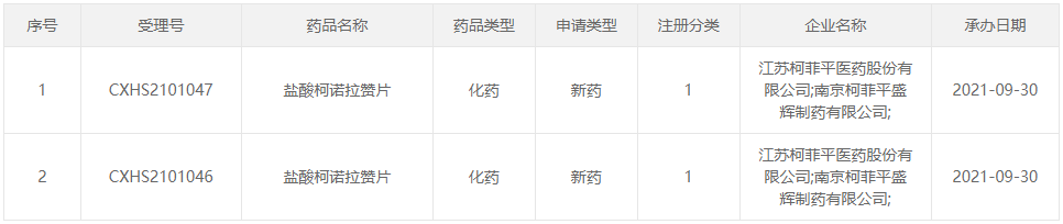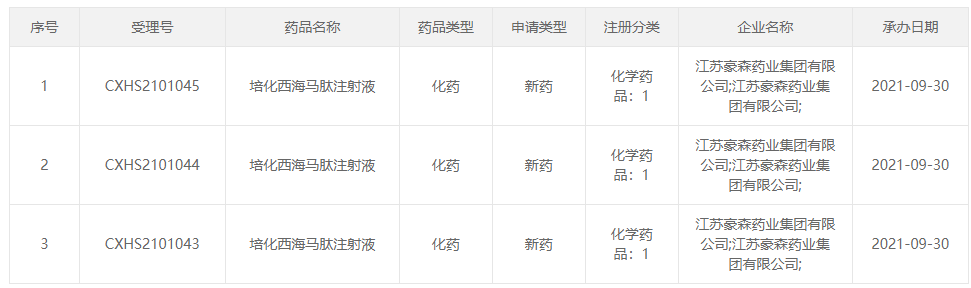 2021年9月30日,CDE官网显示,豪森药业1类新药培化西海马肽注射液上市申请获国家药监局受理。