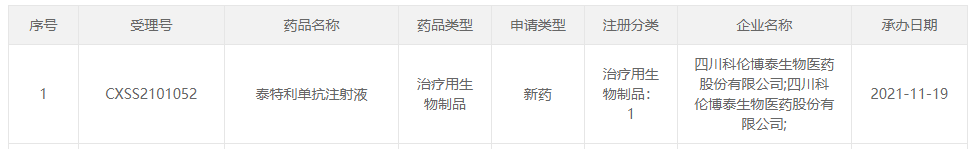 2021年11 月 19 日,科伦药业 1 类新药泰特利单抗上市申请获受理。这是一款 PD-L1 单抗,本次申报的适应症为:既往接受过二线及以上化疗失败的复发或转移性鼻咽癌。