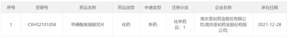 2021年12月28日,CDE官网显示,南京圣和药业1类新药甲磺酸奥瑞替尼片上市申请获NMPA受理。