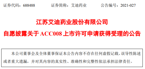 2021年5月20日,江苏艾迪药业股份有限公司发布公告称,旗下抗艾滋病领域在研1类新药ACC008片(复方ACC007片,简称“ACC008”)境内生产药品注册上市许可申请获国家药监局受理。