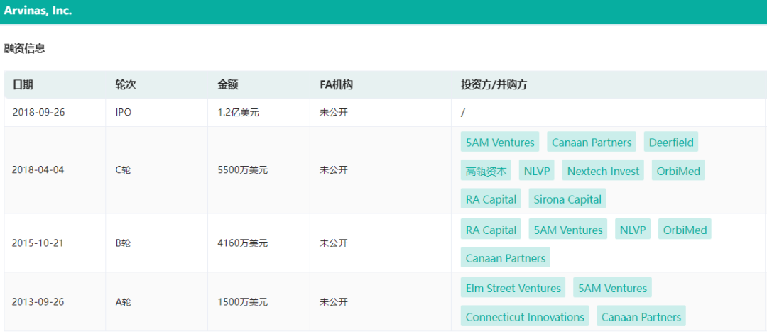 据药融云投融资数据库显示,Arvinas在一级市场完成了3轮融资,金额超2亿美元,主要投资方包括Canaan Partners、5AM Ventures等,国内的高瓴资本参与了C轮融资。2018年9月,Arvinas在纳斯达克完成1.2亿美元的IPO(NASDAQ:ARVN),发行价每股16美元。
