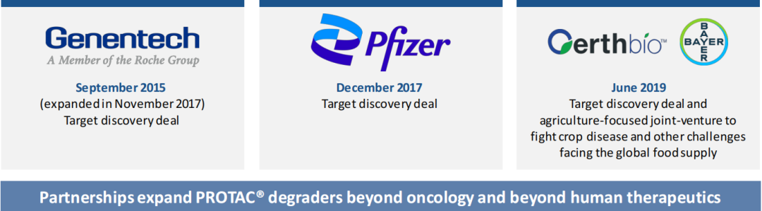 为了充分发挥APROTAC技术的潜力,Arvinas与多家企业建立了合作伙伴关系,包括基因泰克、辉瑞、拜耳。OerthBio LLC是Arvinas和拜耳共同成立的合资实体,旨在研究、开发和商品化农业领域的PROTAC靶向蛋白降解剂。