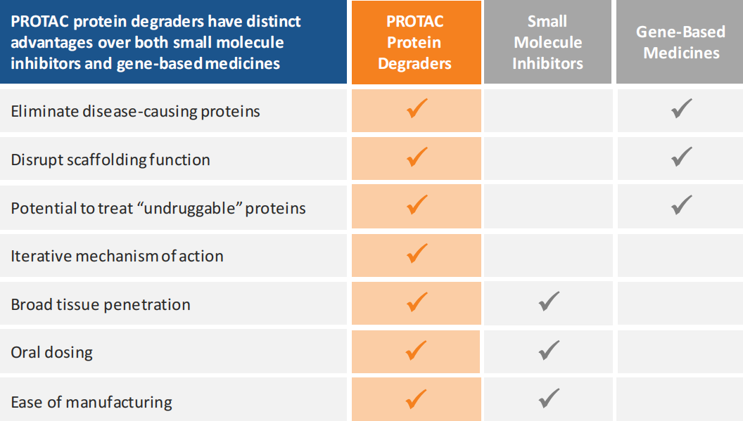 与其他治疗方式,如小分子、基因疗法相比,PROTAC介导的蛋白质降解具有多种优势: