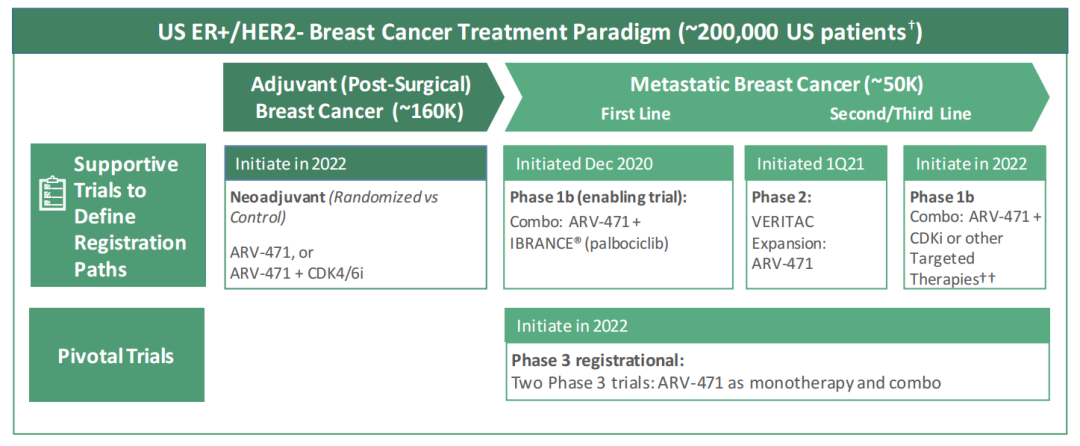 与辉瑞建立合作后,ARV-471的开发速度加快,Arvinas计划在2022年下半年公布2期VERITAC试验剂量拓展数据(200mg和500mg),以及1b期与哌柏西利(palbociclib)联用的安全性数据。此外,公司还计划于2022年启动ARV-471与依维莫司(everolimus)联合治疗转移性乳腺癌患者的1b期试验、与CDK抑制剂或其他靶向疗法联用的1b期试验、作为早期乳腺癌患者新辅助治疗的2期临床试验,以及2项单药和联合治疗转移性乳腺癌患者的关键3期临床试验。
