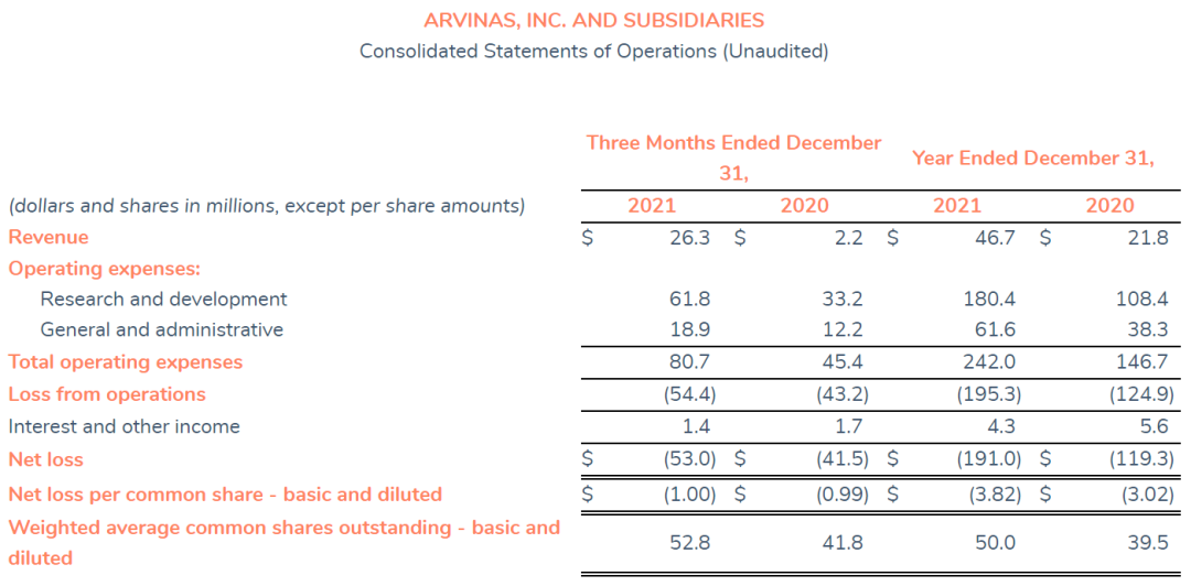 2021全年Arvinas公司总收入4670万美元,主要来源于研究合作和许可收入;全年研发支出为1.804亿美元,主要是由于平台和探索性项目开发,临床试验推进引起相关费用增加;一般及行政开支为6160万美元;公司全年净亏损为1.91亿美元。