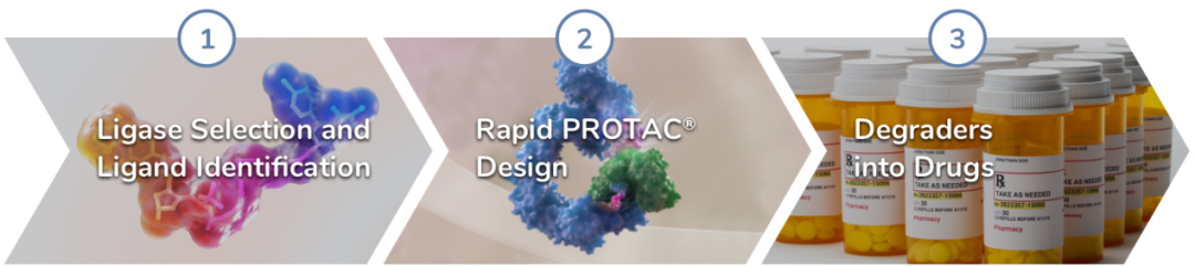 Arvinas专有的PROTAC®发现引擎是靶向蛋白降解领域领先的技术平台,利用人体自身的天然蛋白质处理系统选择性、有效地降解和去除致病蛋白质。凭借该发现引擎,公司旨在开发靶向蛋白降解药物,并推向临床,最终使患者获益,他们的药物发现过程主要分为三个步骤: