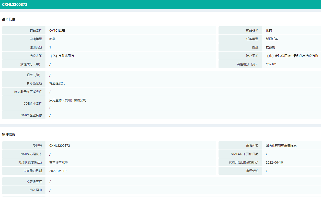 排名第三的QY-101软膏是一款皮肤病用药,参考适应症为特应性皮炎,由启元生物(杭州)有限公司提交临床申请。目前,启元生物共有18个化药1类新药受理号获CDE承办,涉及2个品种,分别是QY-101软膏、QY-201片(抗肿瘤药和免疫机能调节药)。