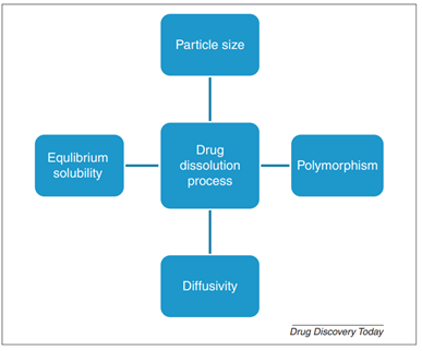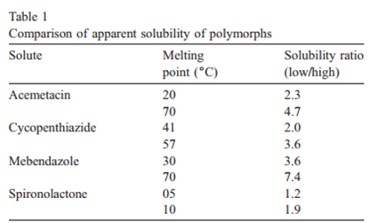 化合物的溶解度,一般指平衡溶解度,即在一定温度和压力之下,固体物质在一定溶剂中达到固液平衡时所溶解的溶质的量,是化合物的固有性质。但是,对于溶解度的数值并不一定是固定不变的,其和化合物的固态形式(无定形态,亚稳定型晶型,稳定型晶型),溶解化合物的溶剂成分(比如不同缓冲溶液体系)以及测量方法(平衡时间,样品处置方法等)都有关系。固体物质的溶解度一般与其自由能相关,一般稳定型的结晶熵小,熔点高,溶出速率慢,溶解度小;亚稳定型相反,无定形型更甚不同,具有更大自由能,热力学不稳定,提高固态物质的溶解度和溶出速率。