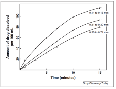 图3说明了粒径减小对非那西汀溶出的影响。对于难溶性药物,通常采用减小粒径(至约3-5μm)作为提高药物溶出率的成功策略。重要的是要注意,对于某些药物,粒径过小会导致表面电荷暴露,从而延缓药物溶出速度。粉末的可用有效表面积在一定程度上取决于溶出介质润湿颗粒的能力。如果溶出介质的润湿性较差,则微粉化会产生粉末颗粒的团聚,由于表面积增加,会导致溶出速率降低。