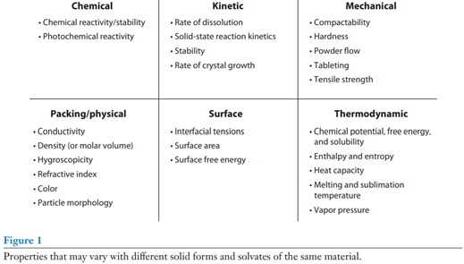 一般多晶型性质的差异如图1所示,包括以下几个方面:①化学性质,化学反应活性/稳定性、光化学反应活性;②动力学性质,溶出速率、固态反应动力学、稳定性、结晶生长速率;③机械性能,可压性、硬度、粉体流动性,可压片性、抗张强度;④堆积/物理性质,导电性,密度(摩尔体积),吸湿性、折射率、颜色、颗粒形态;⑤表面性质,界面张力,表面积,表面自由能;⑥热力学性质,化学势、自由能、溶解度、焓、熵、热容、熔点、升华温度、蒸汽压。同一药物不同的晶型具有不同的物理性质,如熔点,溶解度,溶出速率,进而影响药物的体内吸收,影响制剂的生物利用度;药物对于光,热,湿的敏感程度上的差异,造成了不同不同晶型间在化学性质上的差异,如水解,氧化。下面我们具体谈谈不同晶型间常用理化性质的差异。
