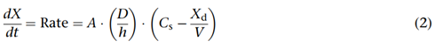 溶出是固体物质溶解的过程。作为固体的基本属性,它受固体和围绕它的液体介质之间的亲和力控制。描述药物溶出过程的理论有很多。Noyes-Whitney方程可能是最常用来描述药物溶出过程和阐明药物溶出中起关键作用的物理化学性质的影响(方程式2):