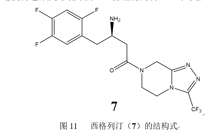 西格列汀(7)是一种抗糖尿病药物,属于格列汀类药物或二肽基肽酶4(DPP-4)抑制剂。磷酸西格列汀(商品名:捷诺维)是第一个这类药物被批准用于治疗2型糖尿病,这使得它成为了排名第15畅销的药物(28亿美元)