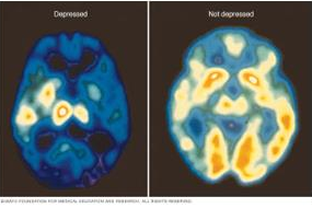 图4 PET扫描对比患抑郁症时的大脑活动(左侧)和正常的大脑活动(右侧)