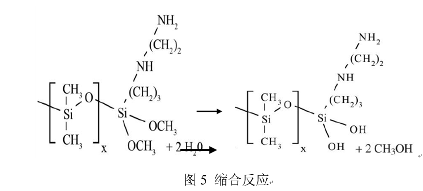 氨基官能聚合物在聚合物链的末端包含少量反应性基团,可以在被处理的表面上交联或“固化”。固化过程需要水分以达到最佳性能。固化过程如下过程:在水分存在下,甲氧基(-OCH3)水解形成羟基(-OH)。羟基具有极强的反应性,可与基质上存在的其他官能团或与硅聚合物上存在的其他羟基发生反应(形成更高分子量的聚合物)。缩合反应由有机硅聚合物上存在的胺基催化。因此,有机硅聚合物可以附着/固化到大多数反应性表面上,并且可以通过分子内缩合,在固化过程中不会除去氨基,而是将它们交联到聚合物网络中。