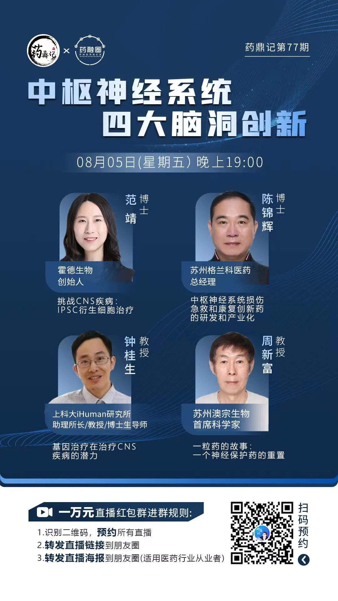8月5日晚上19点,药鼎记直播间邀请了四位嘉宾,分别是:霍德生物创始人范靖博士,苏州格兰科医药总经理陈锦辉博士,上科大iHuman研究所助理所长/教授钟桂生教授,苏州澳宗生物首席科学家周新富教授,将进行中枢神经系统药物创新强强对话,干货满满,欢迎识别下图“二维码”进行预约。