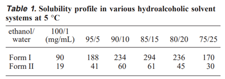 痛定思痛后,进行全面的分析研究发现:虽然晶型FormI是亚稳晶型,但是其具有更高的溶解性和溶出速率,一定程度上可以药物的生物利用度,下表为晶型Ⅰ和晶型Ⅱ在不同比例的乙醇/水中的溶解度差异。其实,晶型Ⅱ具有比晶型Ⅰ更高的熔点(高2-3℃),恰恰也验证了化合物熔点高低对于溶解度的影响。