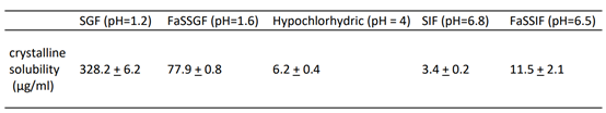 利托那韦的结晶形式显示出明显的pH依赖性溶解度。利托那韦结晶形式在SGF(pH=1.2)和FaSSGF(pH=1.6)中的溶解度相对较高(383µg/ml和77.9µg/ml)。相反,在pH值高于利托那韦pK值(1.9和2.6)的介质中的溶解度非常低。在pH4醋酸盐介质中,溶解度为6.2µg/ml。在SIF(pH=6.8)中,溶解度甚至更低,为3.4µg/ml。在FaSSIFV1(pH=6.5)中,由于胆汁盐和卵磷脂的影响,溶解度稍高(11.5µg/mL),已知它们会增加中度至高度亲脂性化合物的溶解度(利托那韦logP=3.9)。