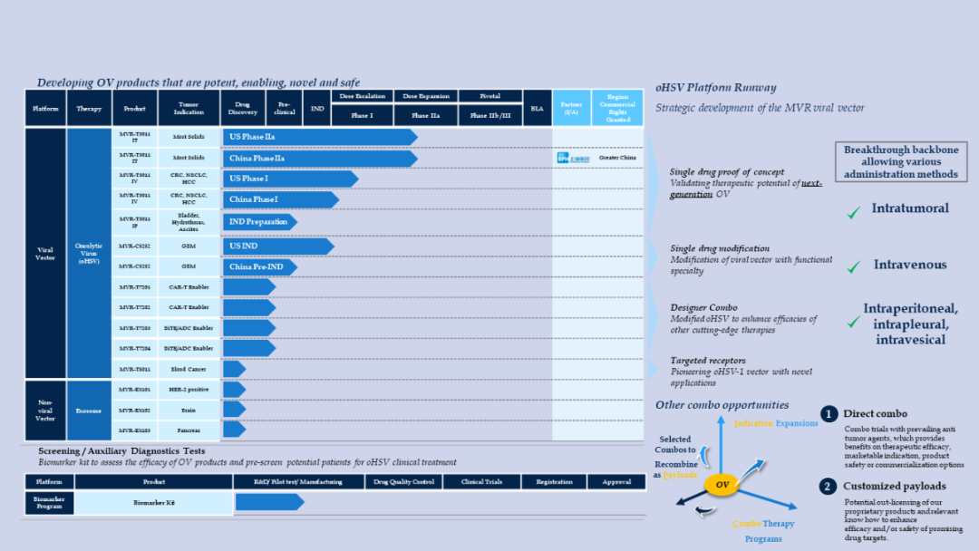 亦诺微医药的第一个临床候选MVR-T3011是一种新型溶瘤病毒(oHSV-1)载体,是亦诺微医药专有的3合1溶单纯疱疹病毒(“oHSV”),用PD-1抗体和IL-12免疫调节有效载荷编码,旨在实现具有肿瘤细胞复制效力的减毒HSV-1的最有利特征。用于肿瘤内给药,在中国、澳大利亚和美国进行全球多中心临床研究。MVR-T3011 IT临床试验始于2020年,目前在美国和中国都处于II期。