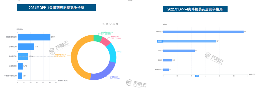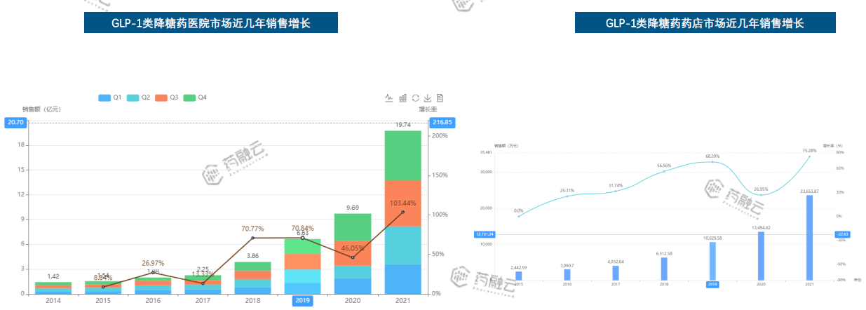 DPP-4类降糖药医院销售在2018年达到增长的最高峰值,近几年仍保持较高幅度的增长。药店市场来看,也保持稳步增长态势。