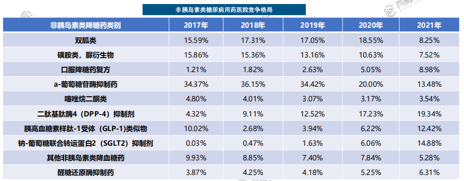 与医院市场不同,在我国药店零售市场,双胍类和磺胺类占比最大,分别是22.66%和11.51%。DPP-4、GLP-1和SGLT-2占比不大,但是呈现增长态势。