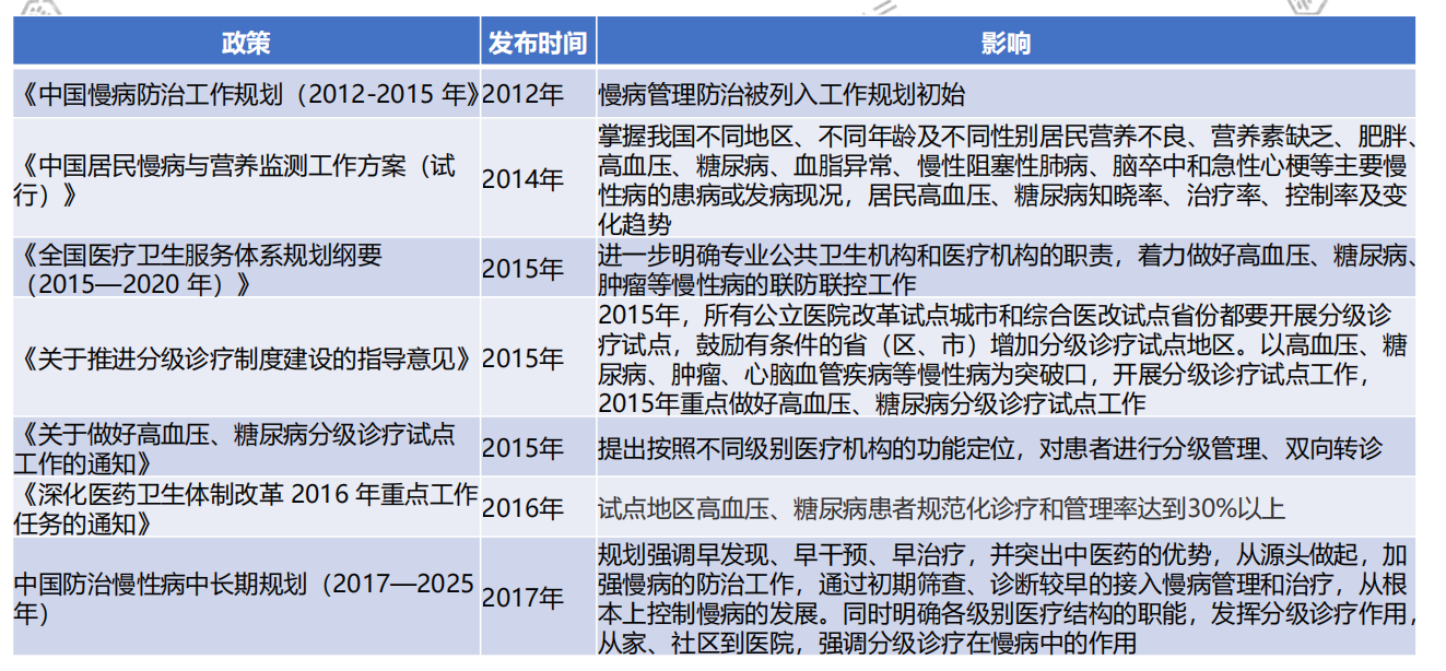 自2012年起,,慢病管理防治被列入工作规划。2015年,进一步明确专业公共卫生机构和医疗机构的职责,所有公立医院改革试点城市和综合医改试点省份都要开展分级诊疗试点。以高血压、糖尿病、肿瘤、心脑血管疾病等慢性病为突破口,开展分级诊疗试点工作。2016年,分级诊疗初见成效,试点地区高血压、糖尿病患者规范化诊疗和管理率达到30%以上。