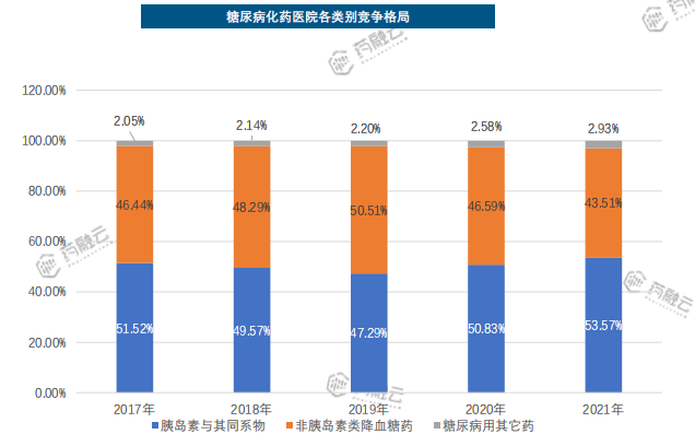 我国糖尿病化药医药市场主要分为胰岛素与其同系物、非胰岛素类降糖药,两者几乎占据了全部市场。2021年胰岛素与其同系物占比53.57%,领先非胰岛素类降糖药,且近几年市场占比逐年上升。