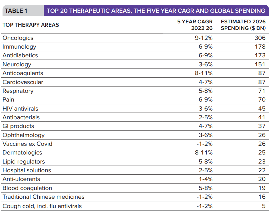 支出排名前5治疗领域是肿瘤学领域、免疫学领域、糖尿病、神经疾病、抗凝药物。由于新疗法和药物使用的显着增加,预计到2026年,全球两大领先的治疗领域——肿瘤学和免疫学的复合年增长率将分别增长9%~ 12% 和6%~ 9%。预计未来五年肿瘤学支出将增加63%,在此期间将增加100种新疗法。