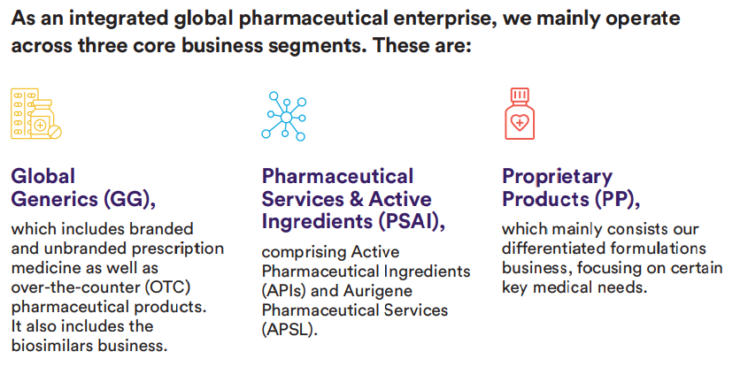 Dr. Reddy's有三个核心业务部分:全球仿制药版块,制药服务与原料药部门(PSAI)版块和专利药物版块。