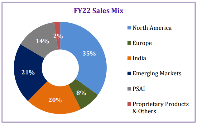 Dr. Reddy's三大业务板块:全球仿制药版块,制药服务与原料药(PSAI)版块和专利药物版块。通过产品和服务组合,瑞迪博士在多个治疗领域开展业务。其中,主要是(i)胃肠道,(ii)肿瘤学,(iii)心血管,(iv)疼痛管理,(v)中枢神经系统(CNS),(vi)呼吸和(vii)抗感染。全球市场中主要地区是美国、欧洲、印度、俄罗斯、独联体(CIS)国家、南非、中国、巴西、澳大利亚和其他一些市场。(以下2022年财年的时间段指的是2021年4月1日至2022年3月31日。)